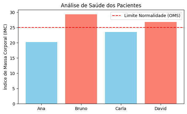 import pandas as pdimport matplotlib.pyplot as plt"""1. DADOS BRUTOS (Data):Fatos registrados sem contexto. Isolados, não permitem tomada de decisão."""dados_pacientes = {'Paciente': ['Ana', 'Bruno', 'Carla', 'David'],'Peso_kg': [55, 95, 68, 82],'Altura_m': [1.65, 1.80, 1.70, 1.75]}df = pd.DataFrame(dados_pacientes)"""2. TRANSFORMAÇÃO EM INFORMAÇÃO (Information):O cálculo do IMC contextualiza peso e altura, conferindo significado aos dados.Uma nova coluna 'IMC' é criada, permitindo comparações e análises posteriores."""df['IMC'] = (df['Peso_kg'] / (df['Altura_m'] **2)).round(2)# 3. RUMO AO CONHECIMENTO (Knowledge):# Aplicamos uma regra de negócio (Classificação) para extrair padrões.def classificar_saude(imc):if imc <18.5: return'Abaixo do peso'elif imc <25: return'Normal'else: return'Sobrepeso'# Criamos uma nova coluna 'Status' com a classificação de saúde baseada no IMC.df['Status'] = df['IMC'].apply(classificar_saude)print("=== Tabela Processada (Informação) ===")print(df.round(2)) # Apenas duas casas decimais para melhor visualização# 4. VISUALIZAÇÃO PARA TOMADA DE DECISÃO (Inteligência/Ação)plt.figure(figsize=(7, 4))cores = ['skyblue'if s =='Normal'else'salmon'for s in df['Status']]plt.bar(df['Paciente'], df['IMC'], color=cores)plt.axhline(y=25, color='red', linestyle='--', label='Limite Normalidade (OMS)')plt.title('Análise de Saúde dos Pacientes')plt.ylabel('Índice de Massa Corporal (IMC)')plt.legend()plt.show()print(f"""RELATÓRIO DE EXECUÇÃO:======================- Média de IMC: {df['IMC'].mean():.2f}- Casos de Atenção: {len(df[df['Status'] !='Normal'])}- Total de Pacientes: {len(df)}""")