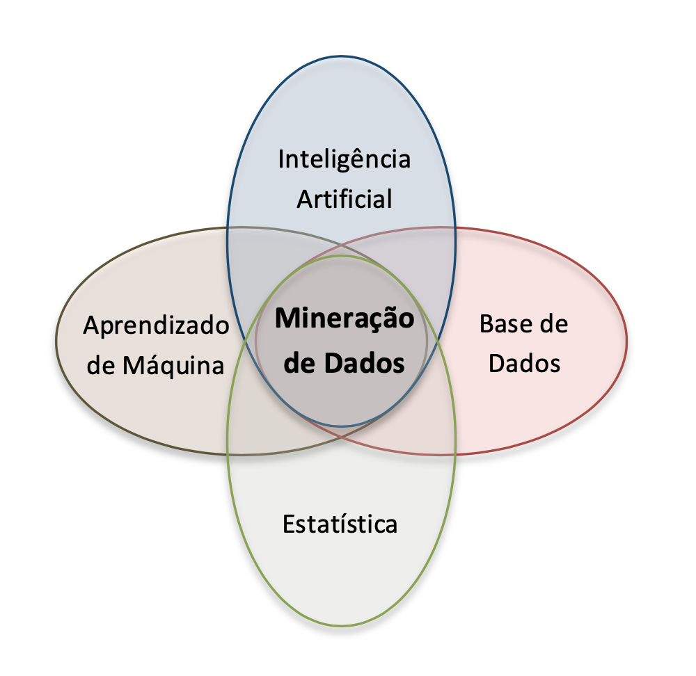 A Mineração de Dados pode ser vista como a sistematização de teorias, técnicas e algoritmos desenvolvidos em outras disciplinas já consagradas, como a Estatística, a Inteligência Artificial, o Aprendizado de Máquina, a Base de Dados etc. O propósito da Mineração de Dados é detectar automaticamente padrões de associação úteis e não óbvios em grandes quantidades de dados, veja Figura 2.1.
