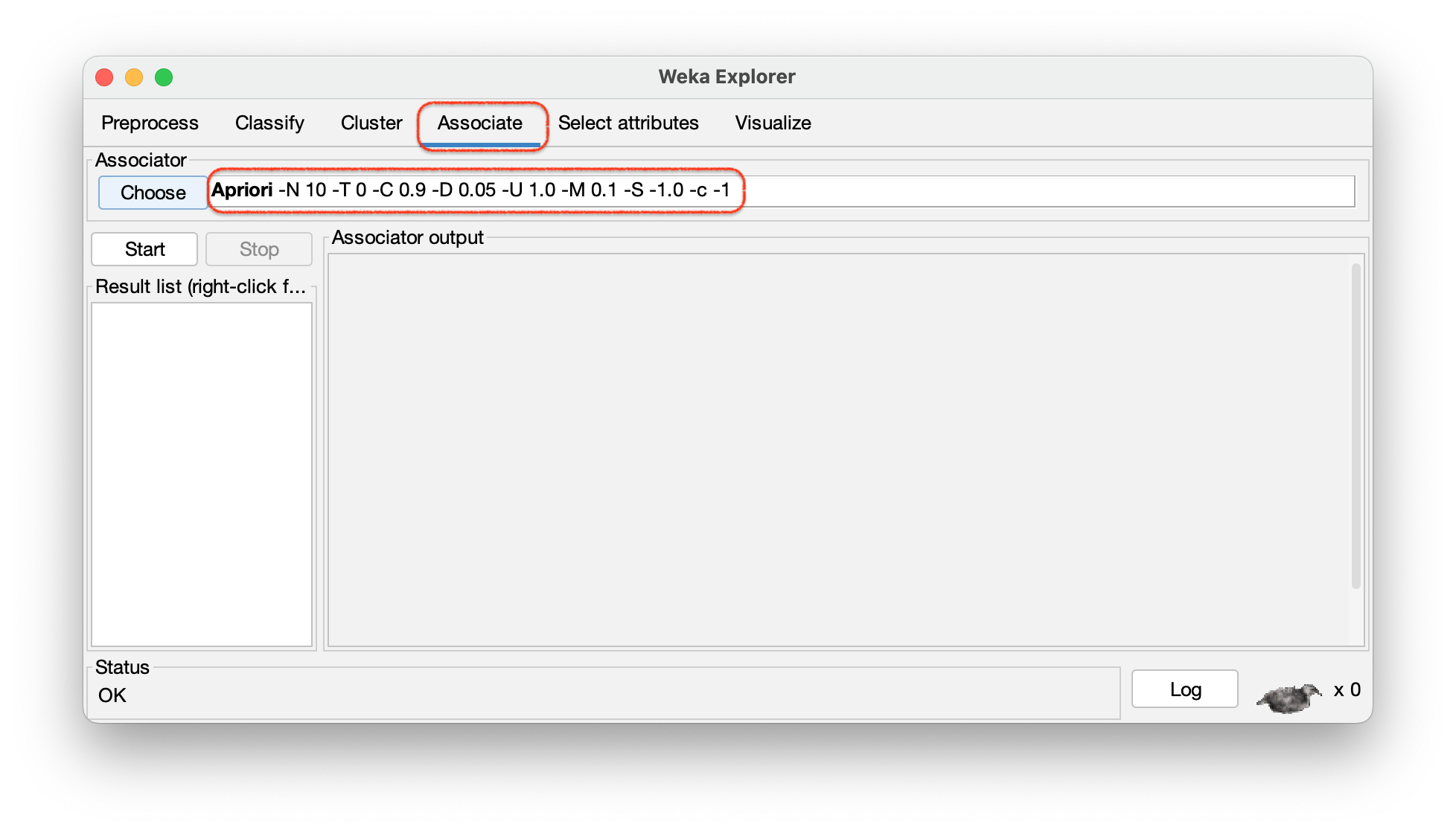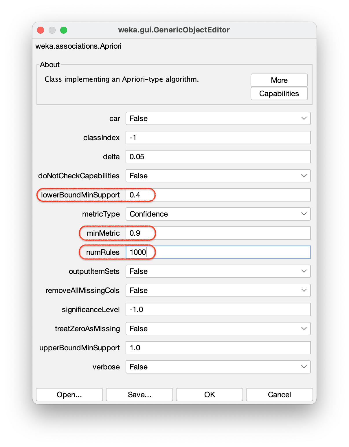 Confiança — a confiança de uma regra reflete o número de exemplos que contêm \(\mathbf{Y}\) dentre todos aqueles que contêm \(\mathbf{X}\) (veja bem, além de \(\mathbf{X} \Rightarrow \mathbf{Y}\), podem existir regras do tipo \(\mathbf{X} \Rightarrow \mathbf{Z}\), \(\mathbf{X} \Rightarrow \mathbf{W}\) etc.). Em outras palavras, o parâmetro Confiança determina quantos são os exemplos em que \(\mathbf{X}\) implica \(\mathbf{Y}\), comparado com aqueles exemplos em que \(\mathbf{X}\) pode ou não implicar \(\mathbf{Y}\). A este parâmetro costuma-se também dar o nome de \(\mathbf{Acurácia}\).